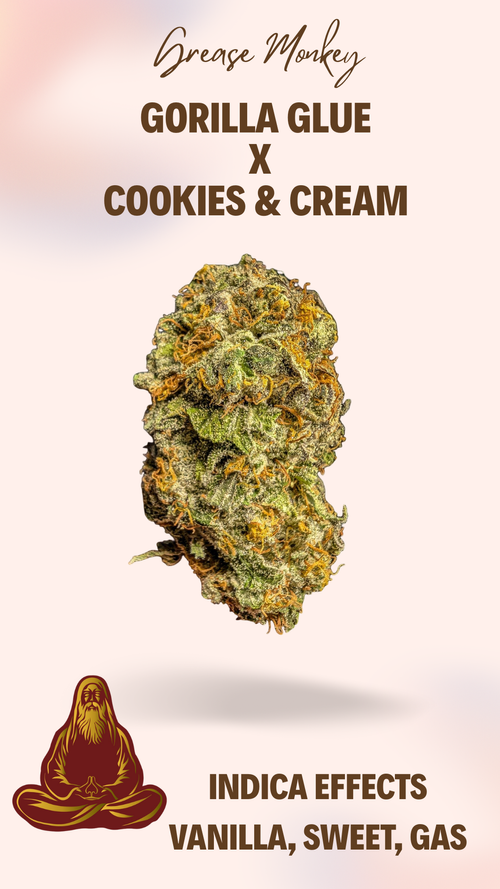 Grease Monkey A highly gassy strain paired with notes of nutty vanilla, sweet and skunky diesel. A slow creeper of euphoric relaxation both cerebral and physical. Building into sedation, perfect for sleepless nights.